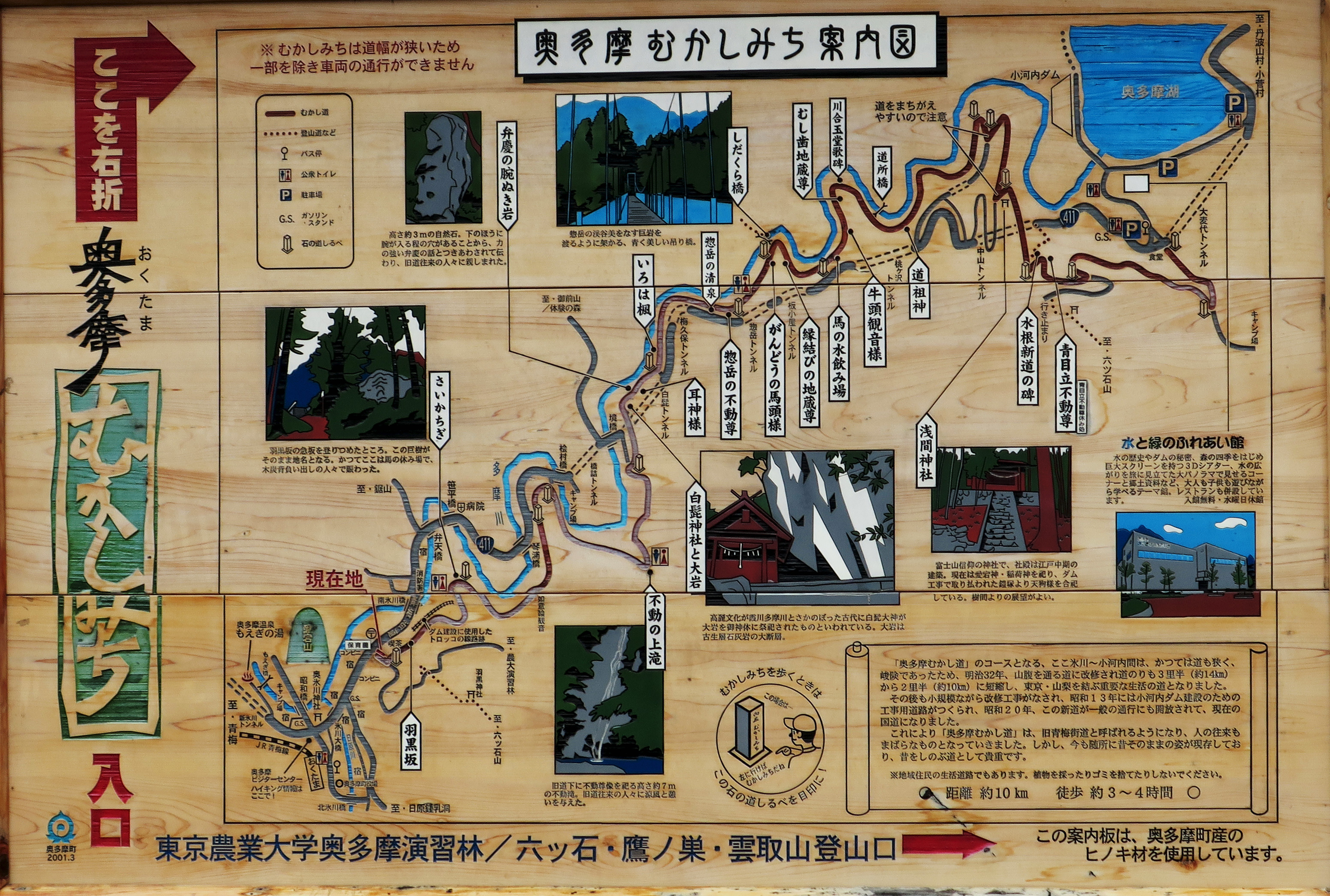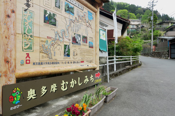 駅から国道411を少し進むと、"奥多摩むかしみち この先左" と書かれた下の写真の大きな看板が現れ、ここから国道411を離れ、山麓に続く旧青梅街道が、『奥多摩むかしみち』 として整備されています。