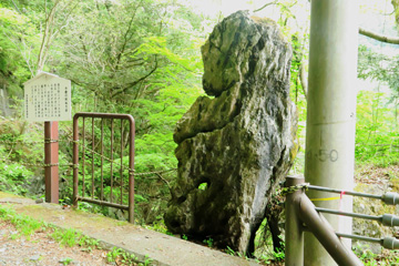 説明版には『白髭神社社殿北側に長さ約20m、高さ約5mにわたってオーバーハングして露出した岩盤です。三世紀石灰岩が白亜紀泥質岩の上に急角度で衝上した逆断層の上盤をつくる崖で、・・・(以下省略)』